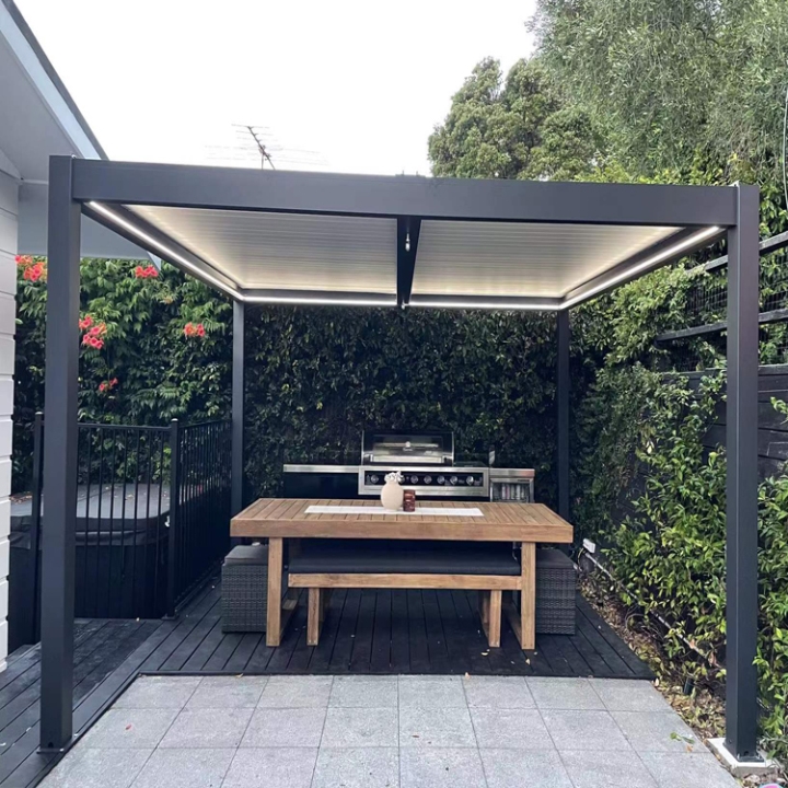 Our most popular aluminum louver pergola system model is our iDP700 Pergola Kits series. There are 4 sizes, including 3x3x2.5m, 3x4x2.5m, 4x4x2.5m, and even 6x4x2.5m. In fact, we can manufacture products of any size! We customize the size for you without any additional cost. Just call us and we will create drawings for you to view and edit.